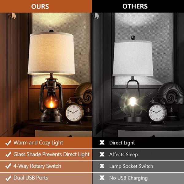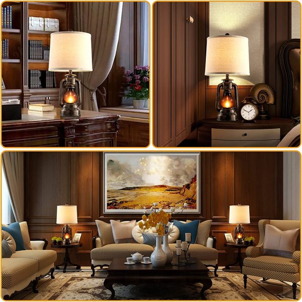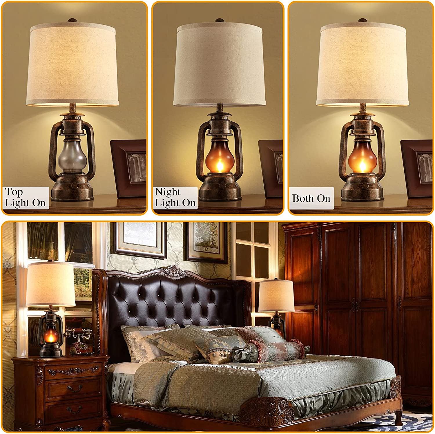 ❤【Set of 2 rustic miner lantern table lamps with nightlights】Oil lamp accent design for vintage industrial country themed rooms. The two light sources can be lit by the four-way rotary switch on the table lamp: top light on,night light on, both on, both off. Perfect for a bedside tables, living room end tables or side tables, or entryway tables.