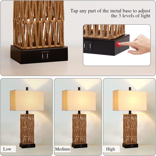 Rattan Table Lamps for Bedroom Set of 2, 3 Way Dimmable Touch Bedside Lamp with 2 USB Ports, Modern Coastal Rectangular Wicker Desk Lamps for Nightstand Living Room End Table, Bulbs Included (Natural)