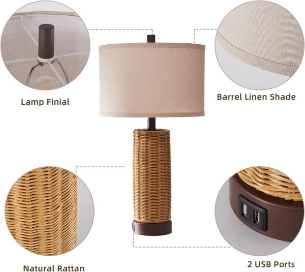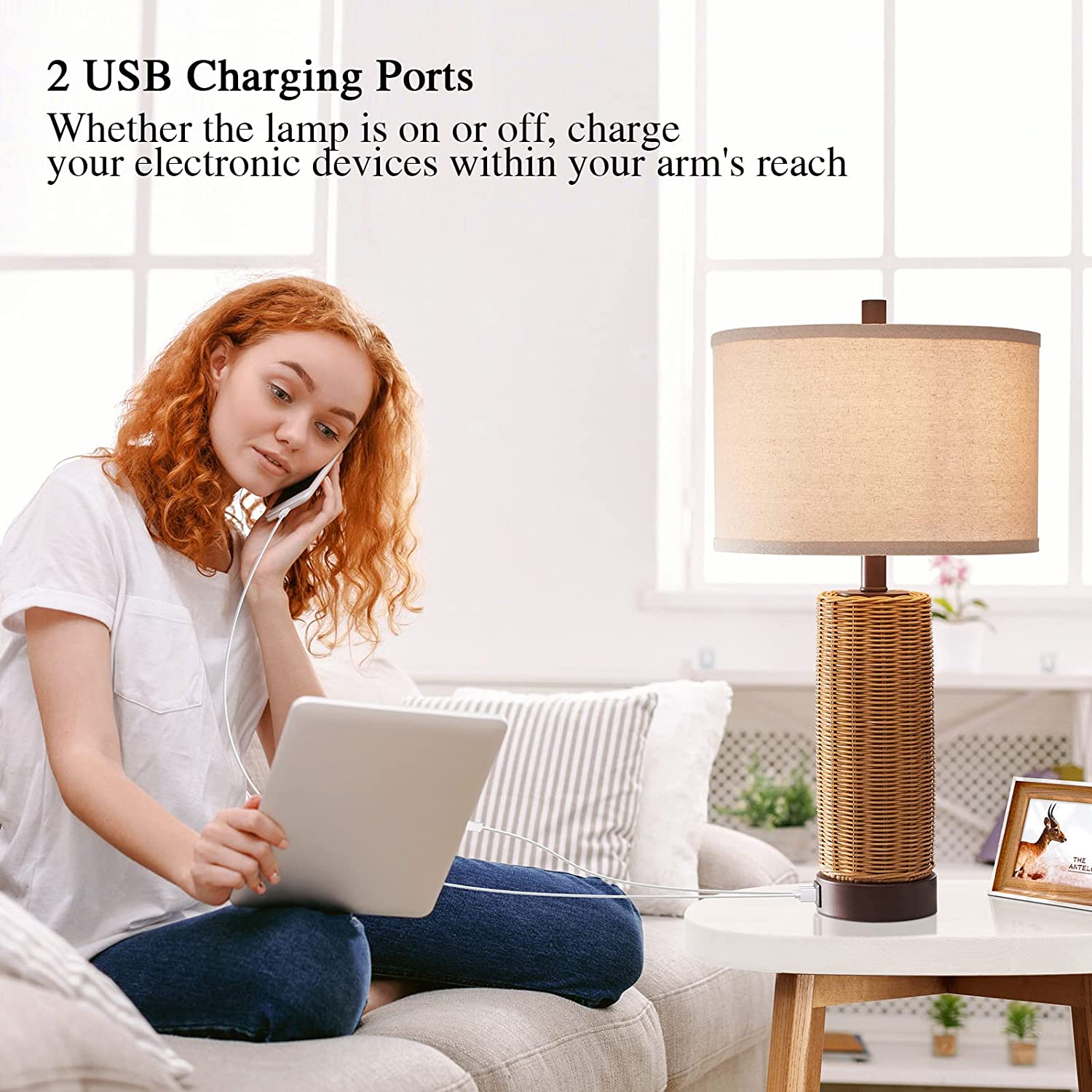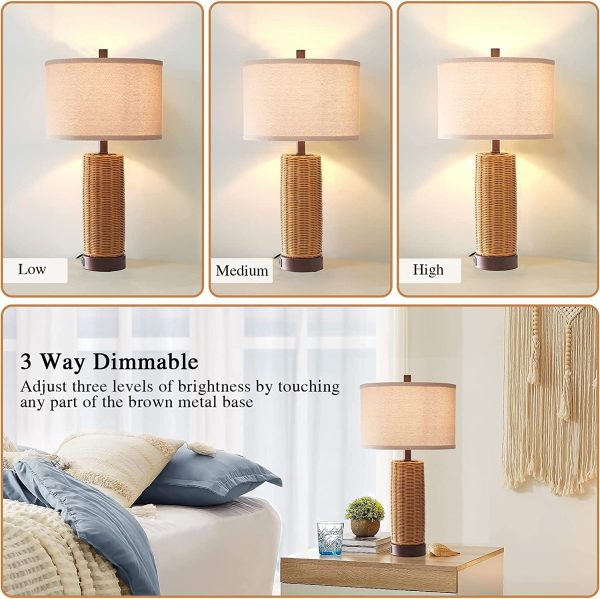 RORIANO Set of 2 Farmhouse Touch Table Lamps for Living Room, 3 Way Dimmable Rattan Lamp with 2 USB Ports, Rustic Natural Seagrass Bedside Lamp for Bedroom Nightstand, 2 LED Bulbs Included (Farmhouse)